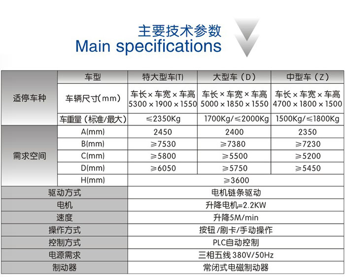 該設(shè)備充分利用空間,一個(gè)車位能停兩輛車。上面層載車板可上下升降:地面層無(wú)載車板,地面層車開出后,上方的載車板下降到地面層,完成存取過程。